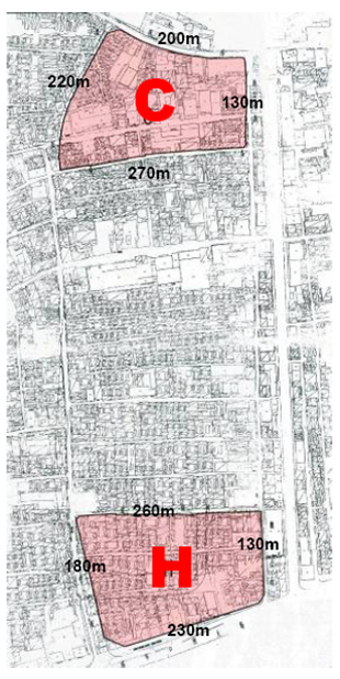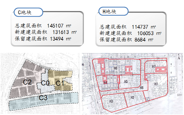 項目由C、H兩個地塊組成,東至珠寶市糧食店街,西至煤市街,項目通過一二級聯動方式實施改造。