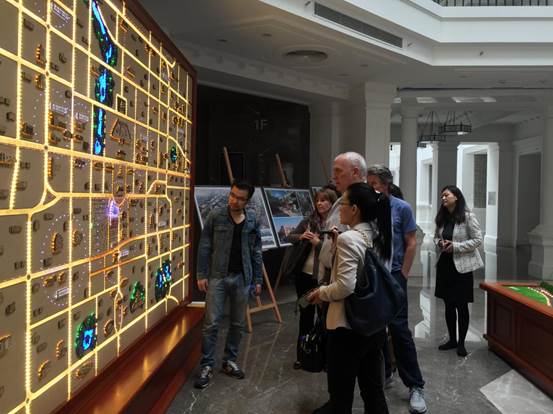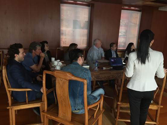 廣安置業營銷總監沈紅梅一行向來訪人員介紹了項目的定位與特點,項目理念、設計細節以及富有民國特色的建筑風格,得到了好萊塢電影大師的一致好評,紛紛饒有興趣的詢問相關信息、拍照留用。Jonathan Bollier表示北京坊項目令人驚艷,Phil Lengyel甚至開玩笑的表示希望能在北京坊擁有一間自己的辦公室。