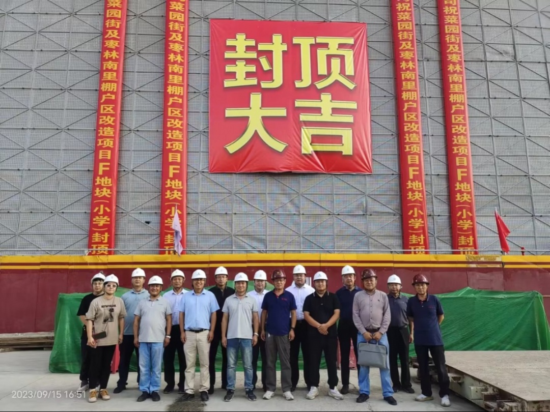 2023年7月13日,經廣安集團黨委批準,菜園街項目成立了“菜園街棚改項目臨時黨支部”,臨時黨支部成立了“青年突擊隊”,圍繞菜園街項目中心工作充分發揮戰斗堡壘和先鋒模范作用,為推動項目建設提速增效凝聚起了強大合力。同時,為積極落實西城區學位保障專班工作要求,在西城區各委辦局的指導下,廣安融盛公司成立了F地塊專項協調小組,廣安融盛公司總經理擔任組長,施工單位、監理單位領導現場辦公,協調解決現場疑難問題,為項目快速推進提供了重大保障。結構封頂這一階段性成果,離不開各參建單位的辛勤付出、精誠配合以及各級領導的大力支持與幫助。至此,第一階段施工任務圓滿完成,為下一階段施工打下了良好的基礎,也為項目按時竣工提供了有力保障。